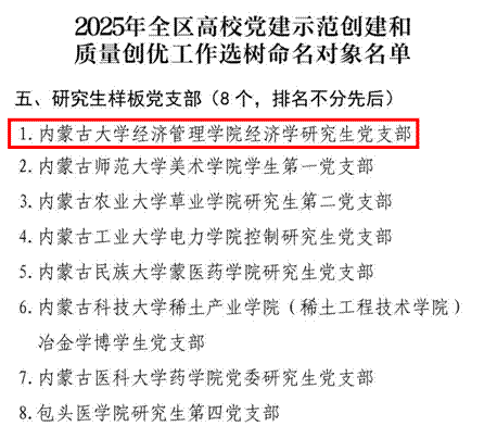 近日,中共内蒙古自治区教育工作委员会公布了2025年全区高校党建示范创建和质量创优工作选树命名对象名单,德赢AC米兰官网经济学研究生党支部入选“研究生样板支部”,标志着学院基层党组织建设取得新成效、迈上新台阶。