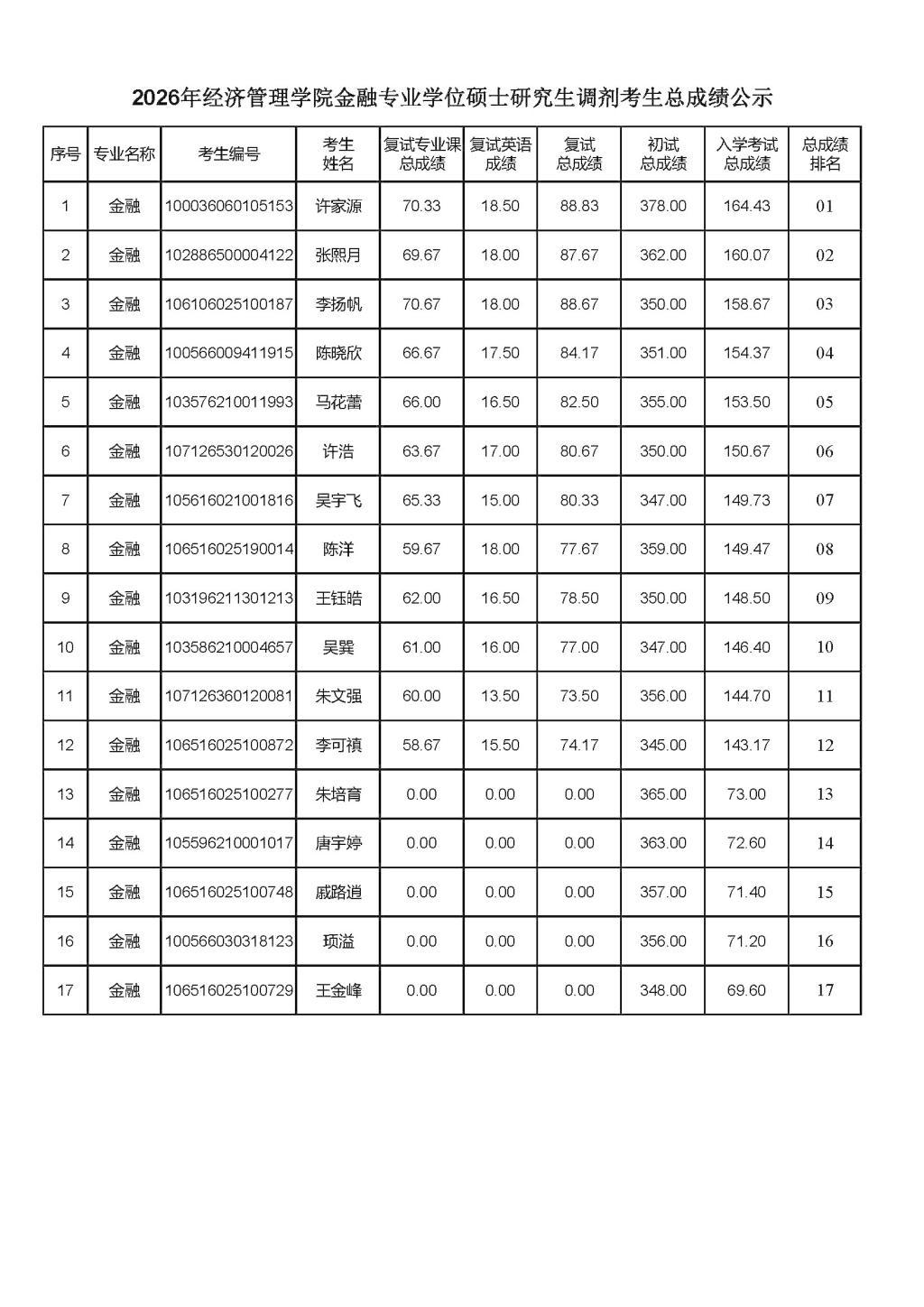 2026年德赢AC米兰官网金融专业学位硕士研究生调剂考生总成绩公示