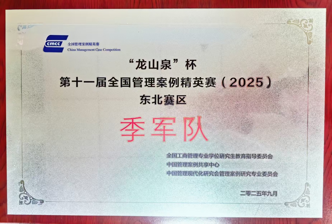 2025年9月13日至14日,第十一届全国管理案例精英赛东北赛区晋级赛在辽宁大学隆重举行。本次大赛由全国工商管理专业学位研究生教育指导委员会指导,中国管理案例共享中心、中国管理现代化研究会管理案例研究专业委员会联合主办,辽宁大学商学院承办,来自辽宁大学、大连理工大学、吉林大学、哈尔滨商业大学、德赢vwin官方入口等17所高校的18支团队参赛。经过激烈的角逐,我院MBA代表队荣获季军。蔡佳辰荣获个人单项奖“最佳风采奖”。